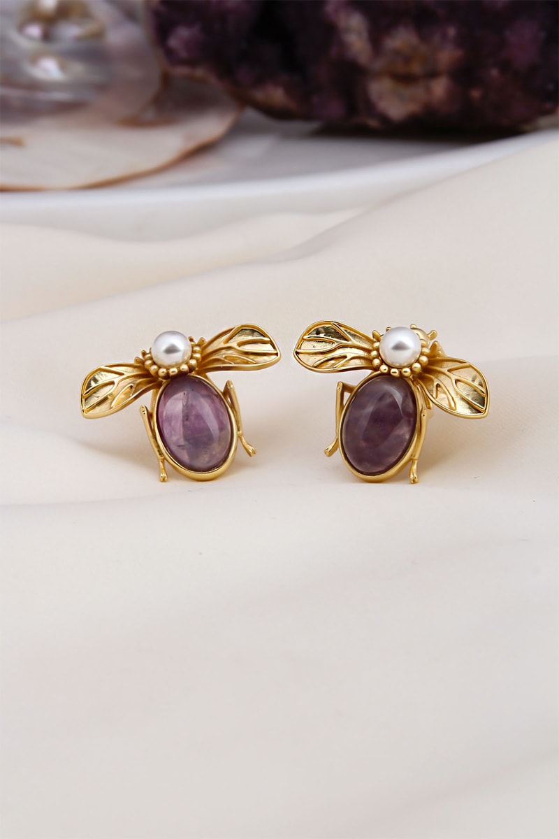 Orecchini con un’ametista e una perla di imitazione.