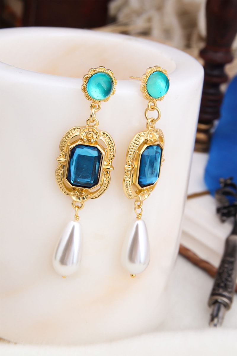 Orecchini pendenti con cristalli e una perla di imitazione.