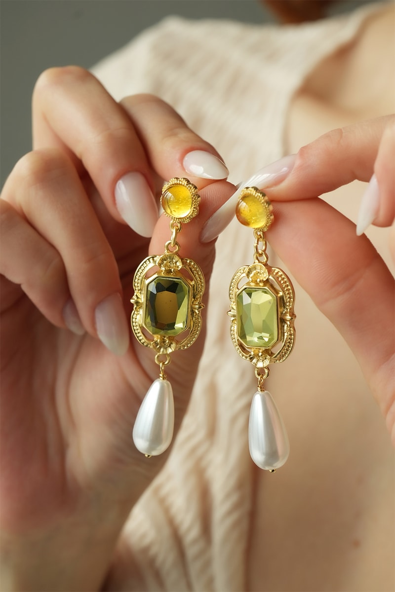 Orecchini pendenti con cristalli e perle di imitazione.