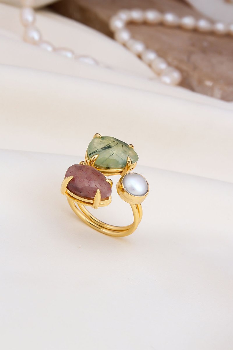 Anello - Placcato oro giallo, prehnite, pietra di sole e perla coltivata