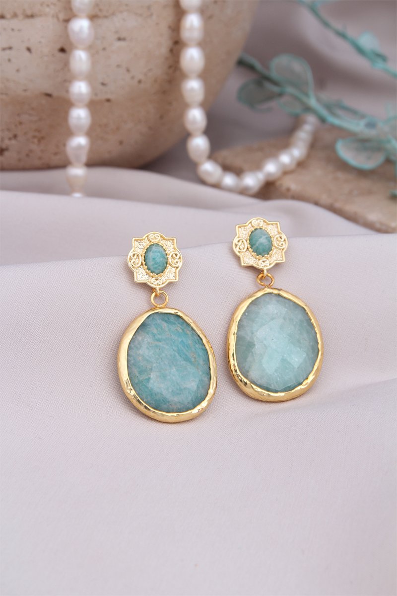 Orecchini laminato oro giallo con un’amazzonite e quarzo.