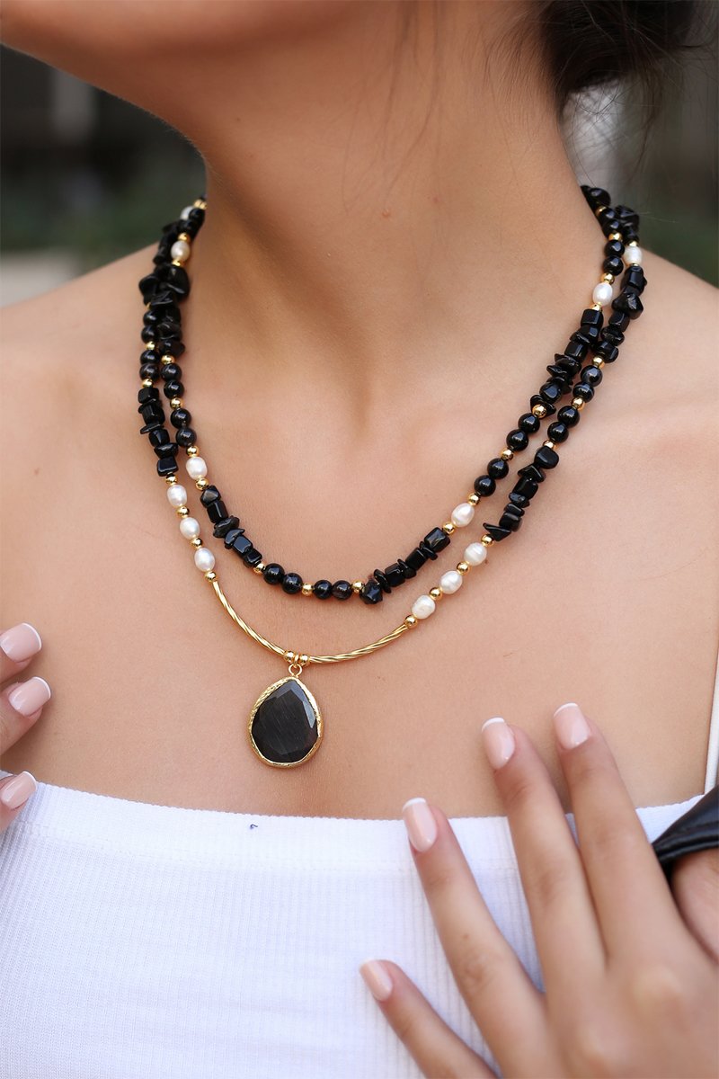 Collana 2 giri - Laminato oro giallo, onice e perle coltivate