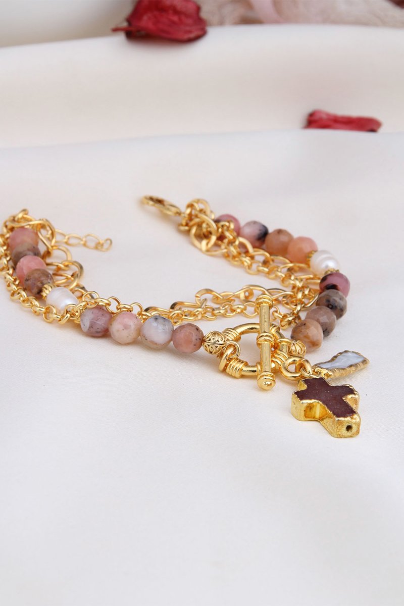 Bracciale con rodoniti, varisciti e perle di imitazione.