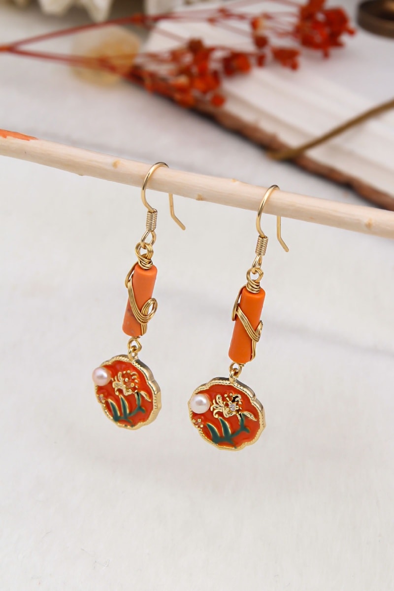Orecchini pendenti placcato oro giallo smaltati con una perla di imitazione.