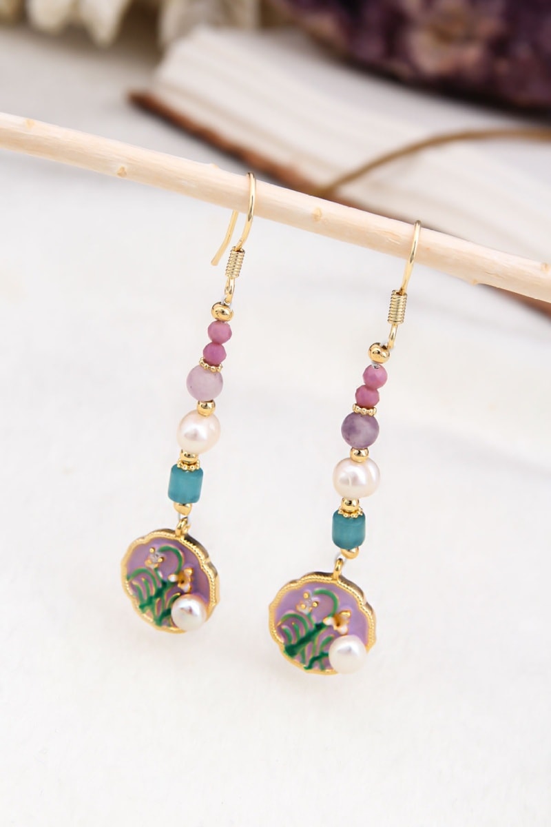 Orecchini pendenti placcato oro giallo con cristalli e perle di imitazione.