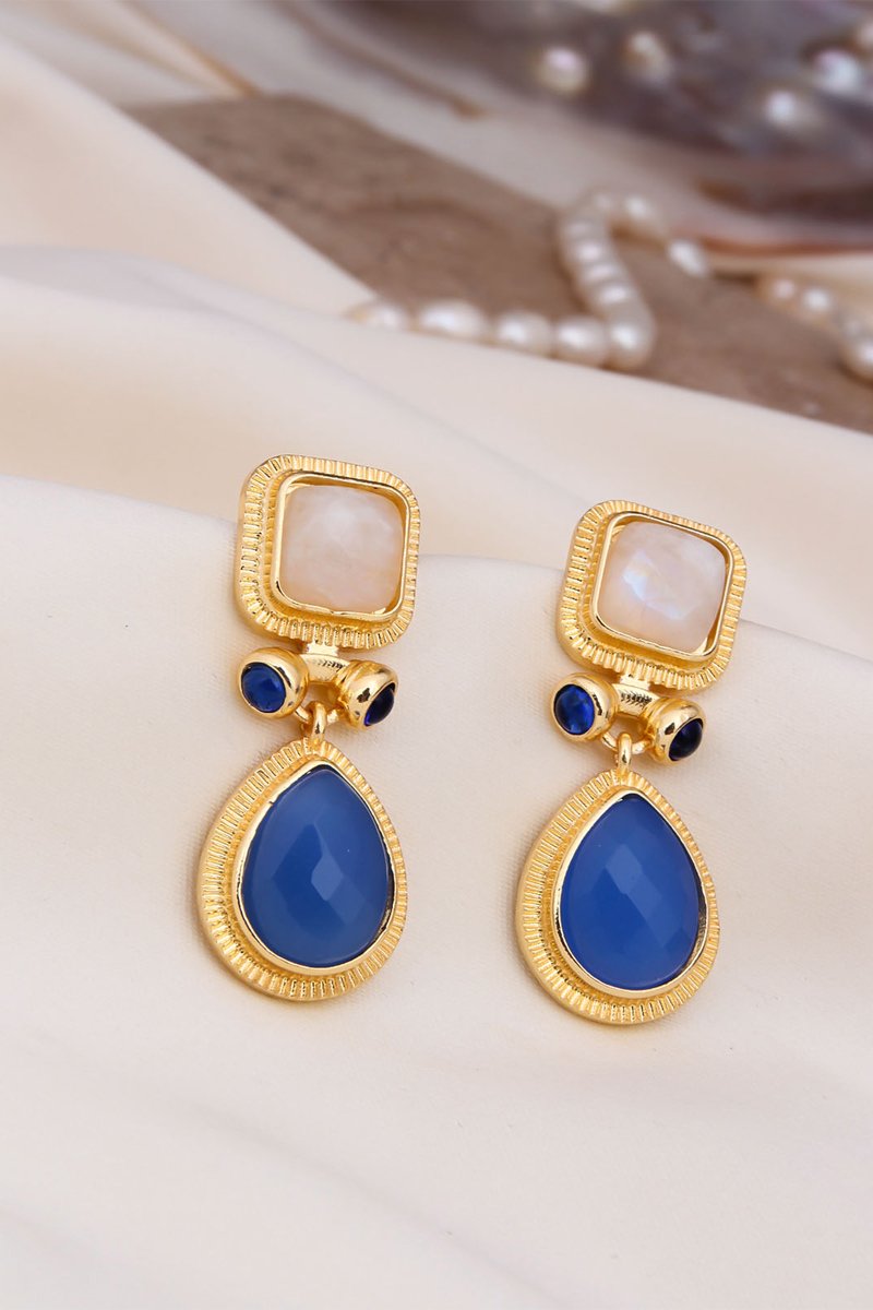 Orecchini pendenti laminato oro giallo con occhi di gatto e pietre di luna.
