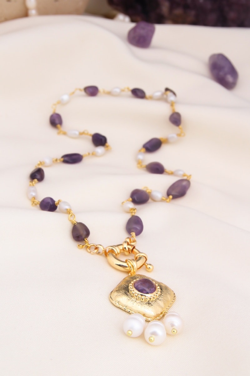 Collana placcato oro giallo con ametiste e 18 perle coltivate.