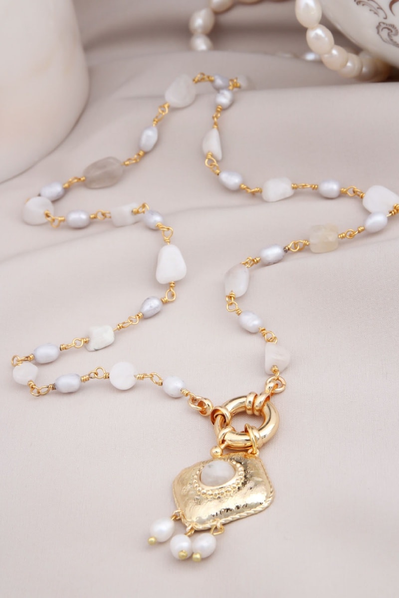 Collana - Placcato oro giallo, perle coltivate e pietra di luna