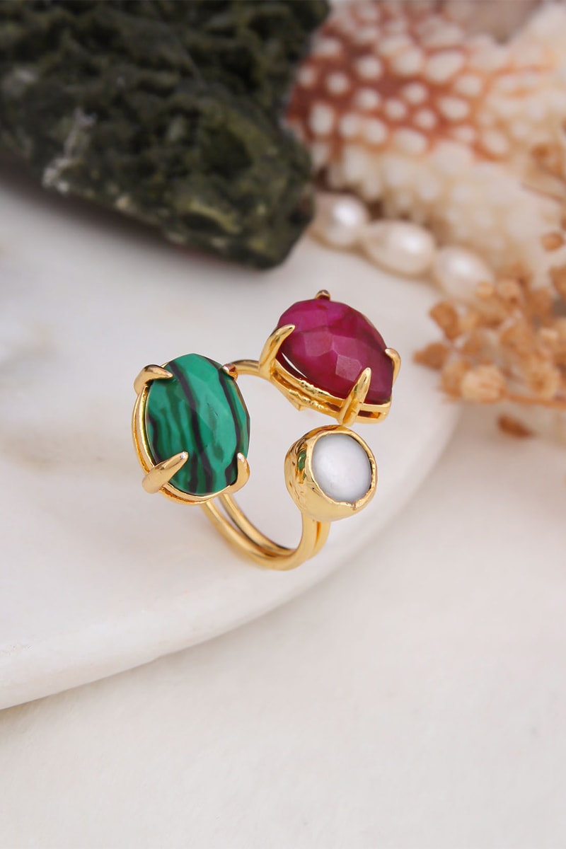 Anello - Placcato oro giallo, malachite, agata e perla coltivata