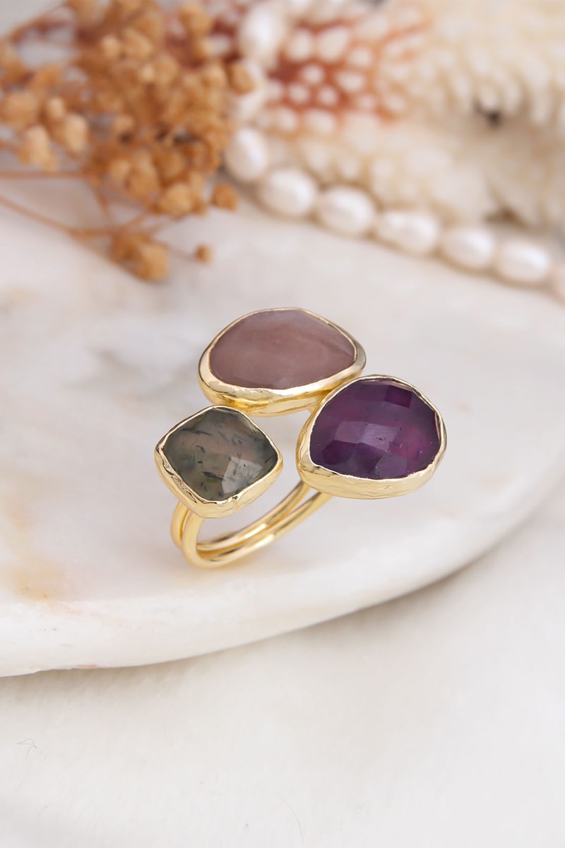 Anello placcato oro giallo con una pietra di sole, una prehnite e un’ametista.