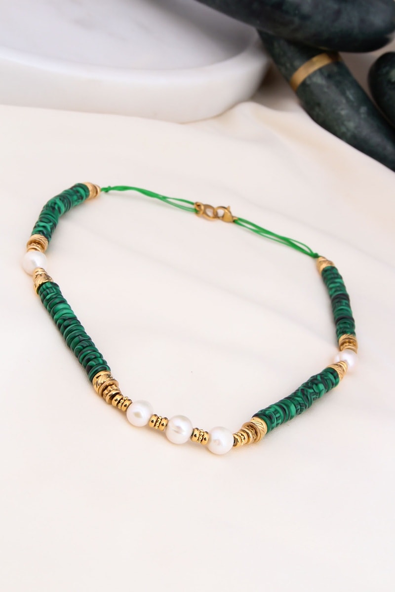 Collana placcato oro giallo con malachiti e di 5 perle coltivate.