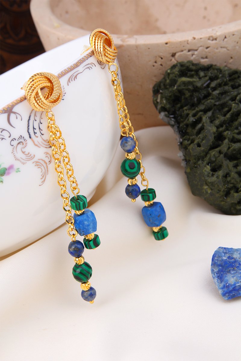 Orecchini pendenti con lapislazzuli e malachiti.