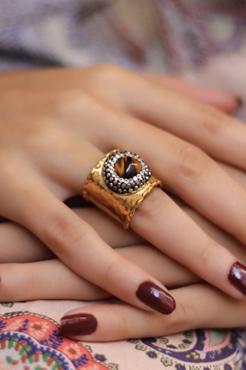 Anello regolabile laminato oro fino giallo con un occhio di tigre e una ematite.