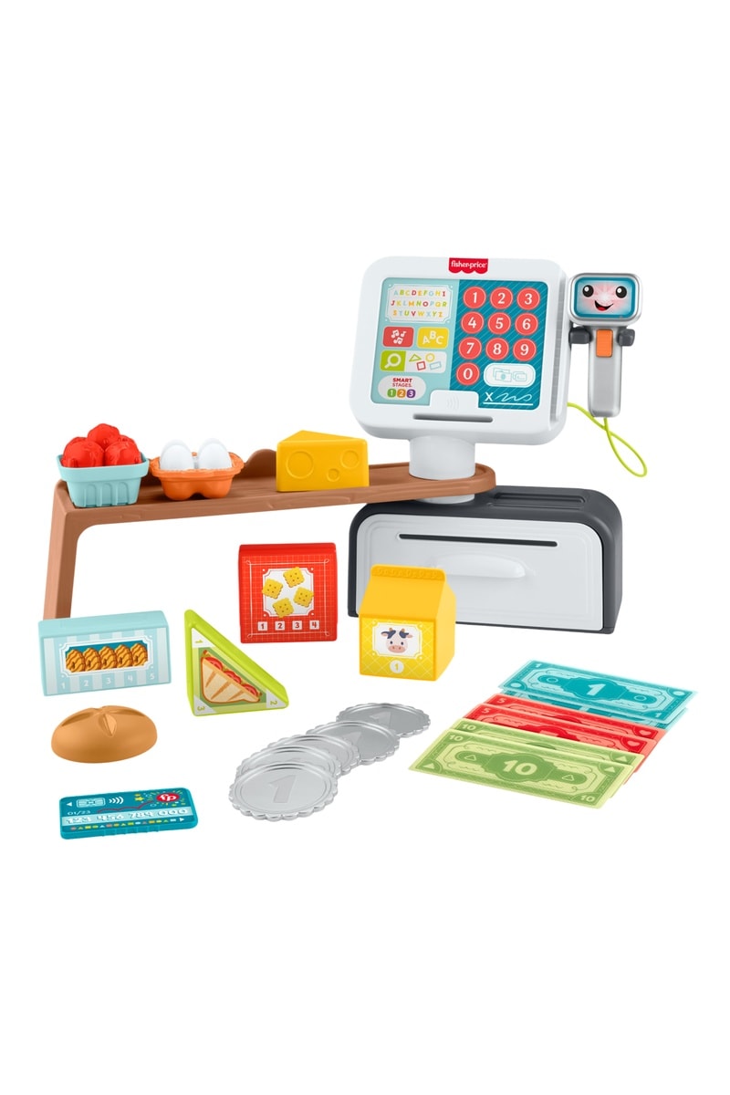 La mia Super Cassa Registratrice Risate e Scoperte di Fisher-Price è un giocattolo educativo elettronico che introduce i più piccoli ai numeri, al calcolo, all'alfabeto, ai colori, alle forme e molto altro ancora! I bambini possono premere i 15 pulsanti della cassa o utilizzare lo scanner per ascoltare oltre 150 canzoni, suoni e frasi. Questo set interattivo include 20 elementi di gioco e 3 livelli di apprendimento Risveglio Progressivo per stimolare l'immaginazione dei bambini nel ruolo di cliente o cassiere. Premere il pulsante a forma di mappamondo per scegliere la lingua: francese, inglese, tedesco o olandese.