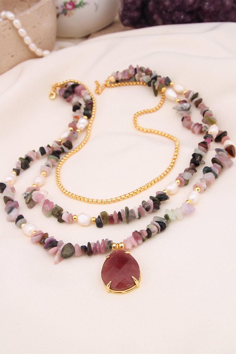 Collana multifilo placcato oro giallo con tormaline e cristalli.