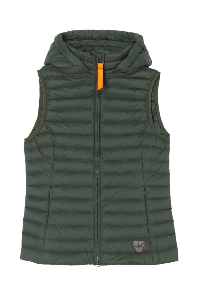 Piumino senza maniche con cappuccio.