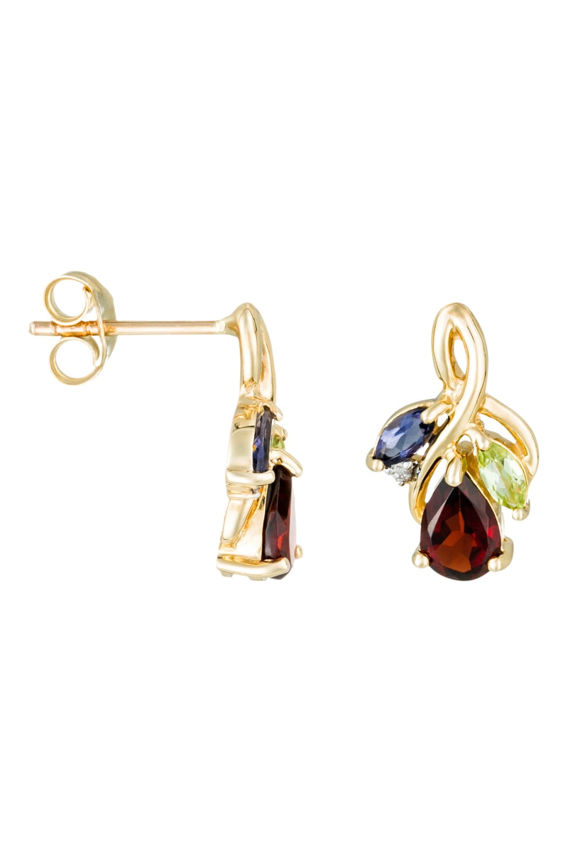 Orecchini in oro giallo con un diamante, un granato, un peridoto e una iolite.
