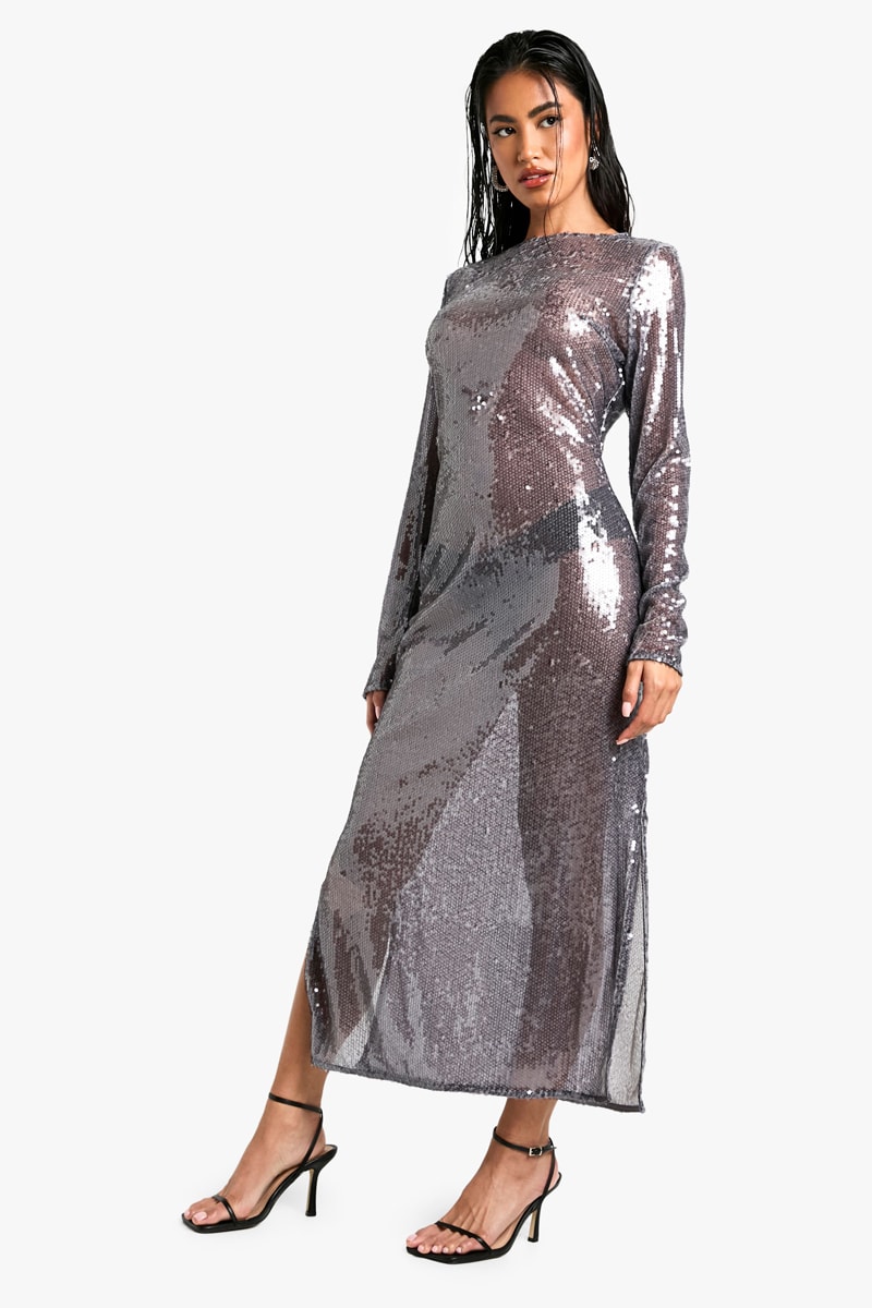 Abito lungo leggermente trasparente con paillettes.