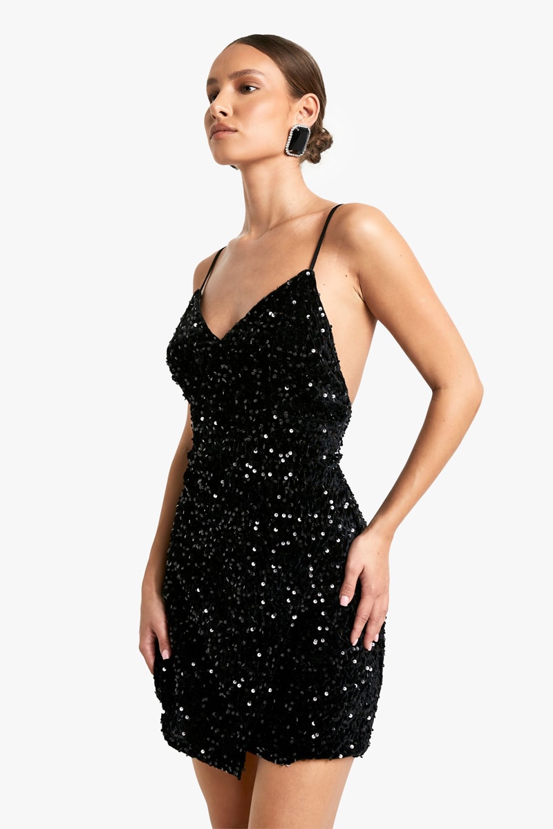 Abito a tubino in velluto e con paillettes.