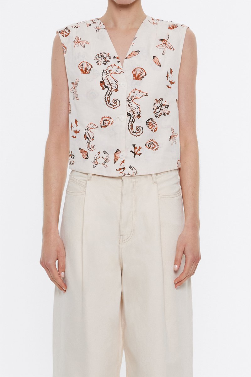 Top senza maniche in lino - Bianco e marrone