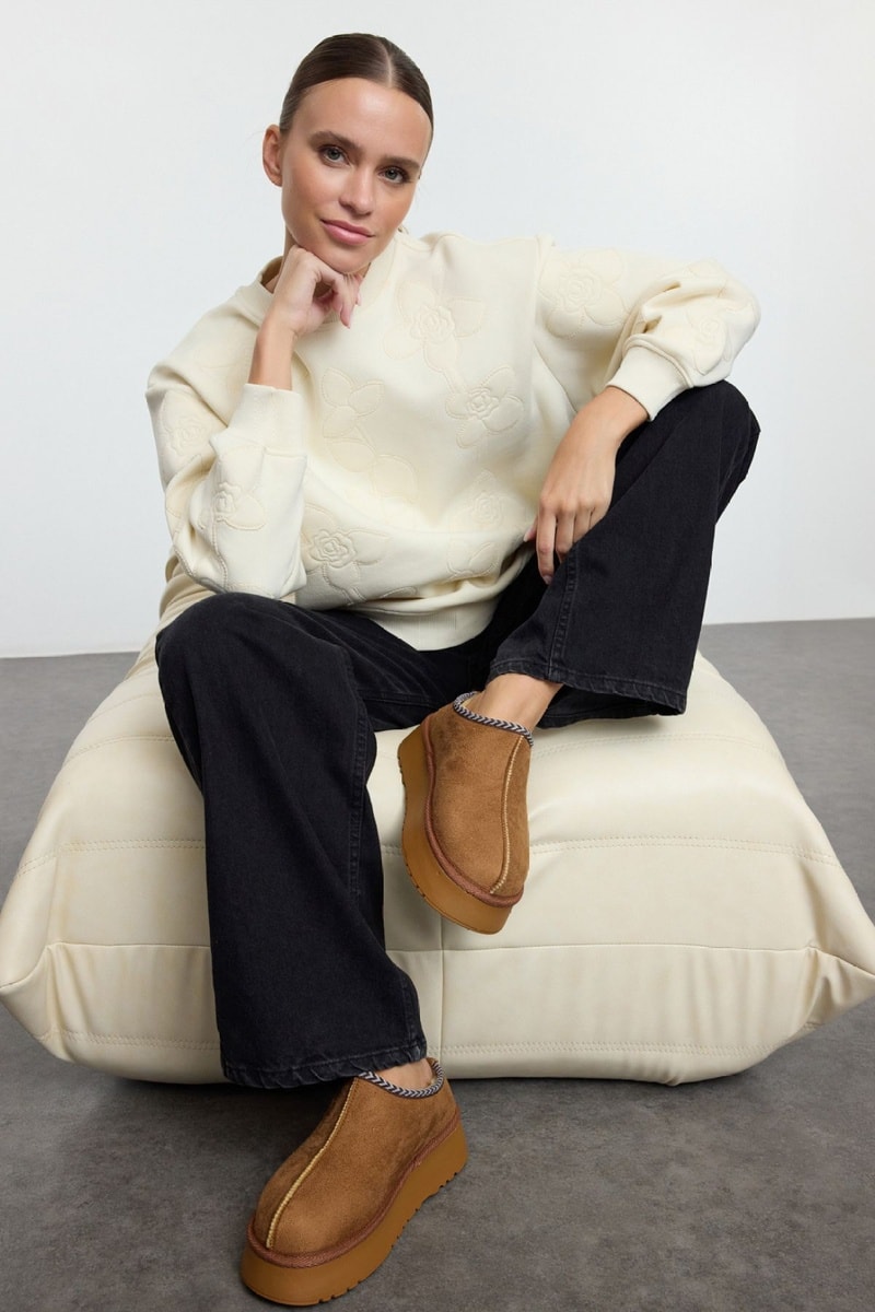 Ciabatte imbottite con zeppa in pelle scamosciata.