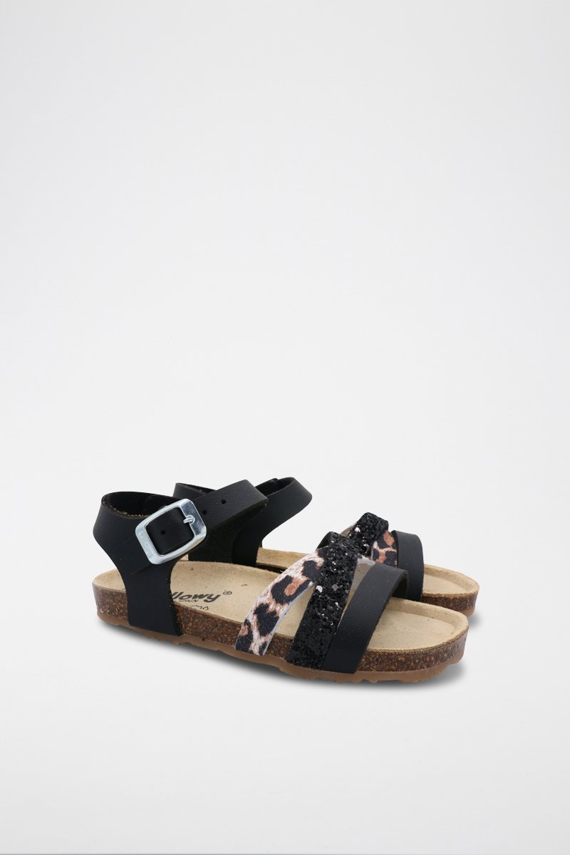 Cinturini incrociati con motivi leopardati e paillettes sul davanti.