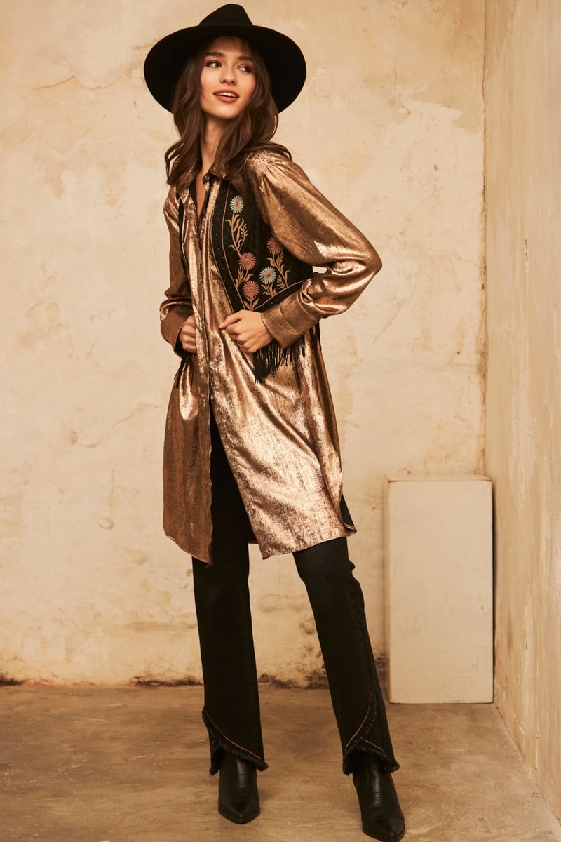 Motivi fiori ricamati e strass sul davanti.