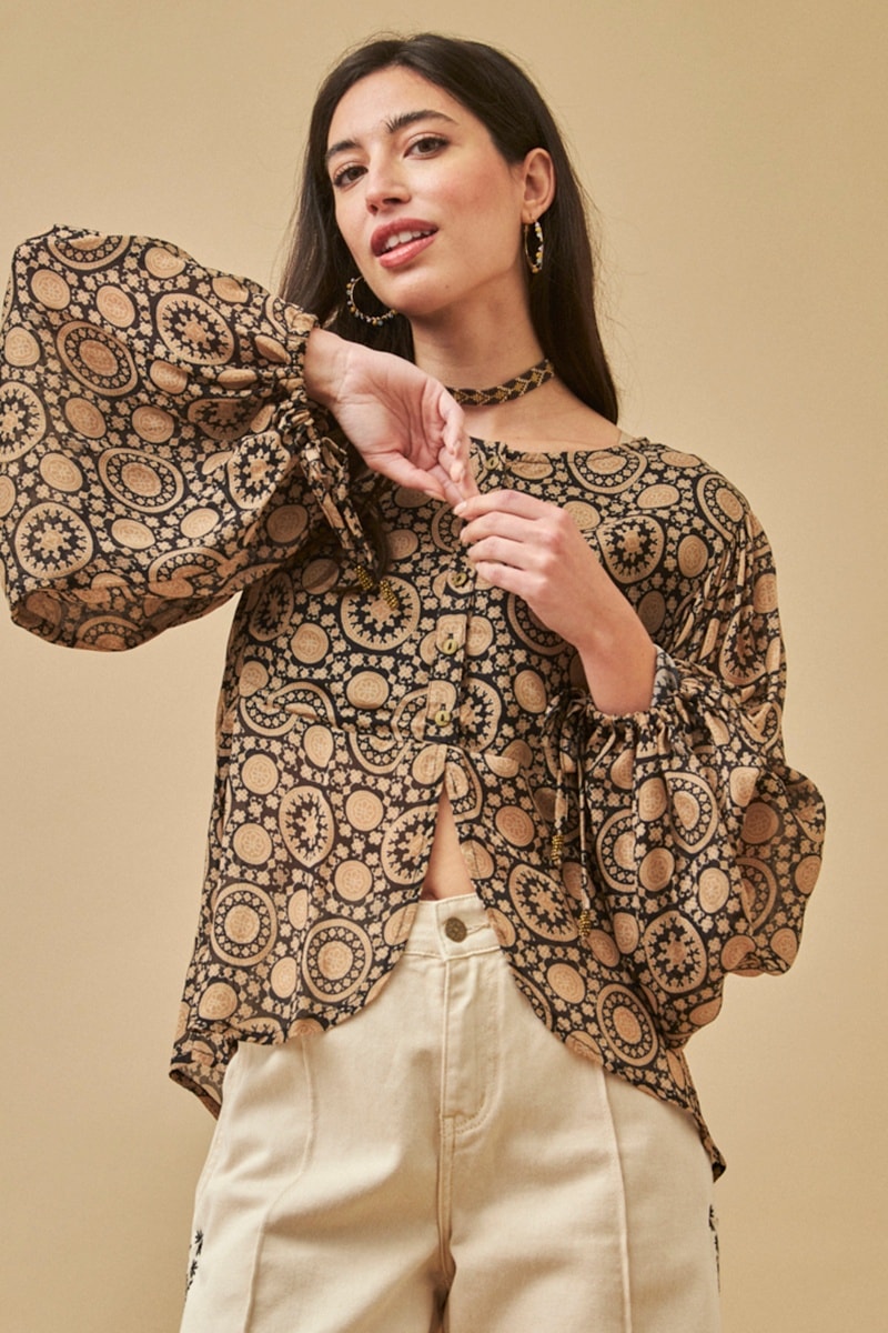 Camicia a maniche lunghe a sbuffo con coulisse.