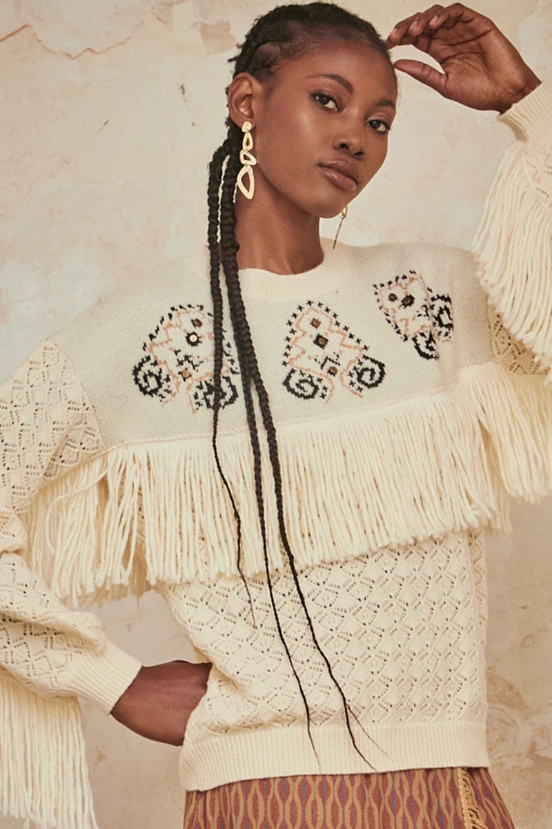 Lavorazione intrecciata e frange sulle maniche, sul davanti e sul retro.