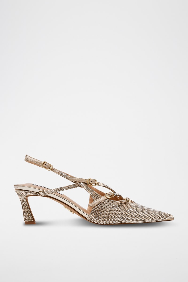 Chiusura con cinturini e fibbia sul davanti e sul lato.