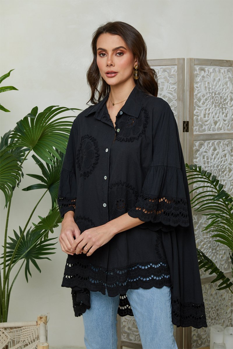 Motivi fantasia ricamati sulle maniche, sul davanti e alla base.