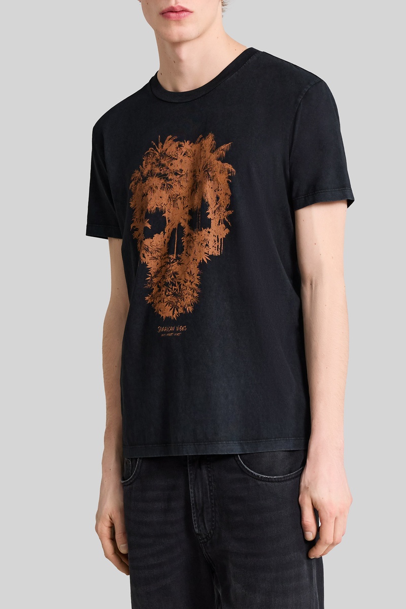 Scritta, motivi teschio, palme e logo sul davanti.