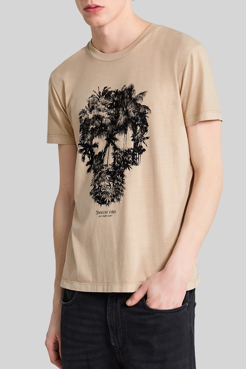 Scritta, motivi teschio, palme e logo sul davanti.