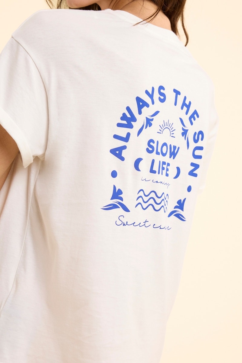 Scritta e motivi sole sul davanti.