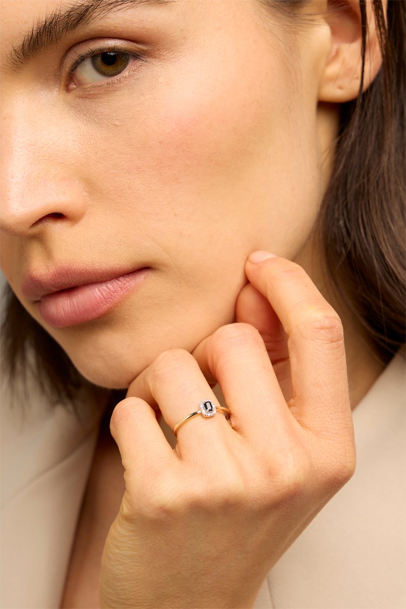 Anello in oro giallo con uno zaffiro e 7 diamanti.