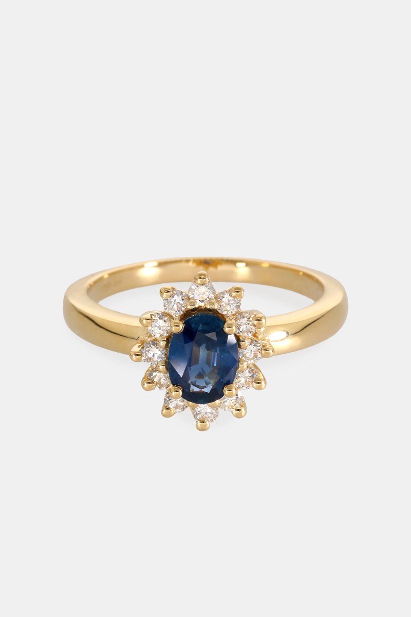 Anello in oro giallo con uno zaffiro e 12 diamanti.