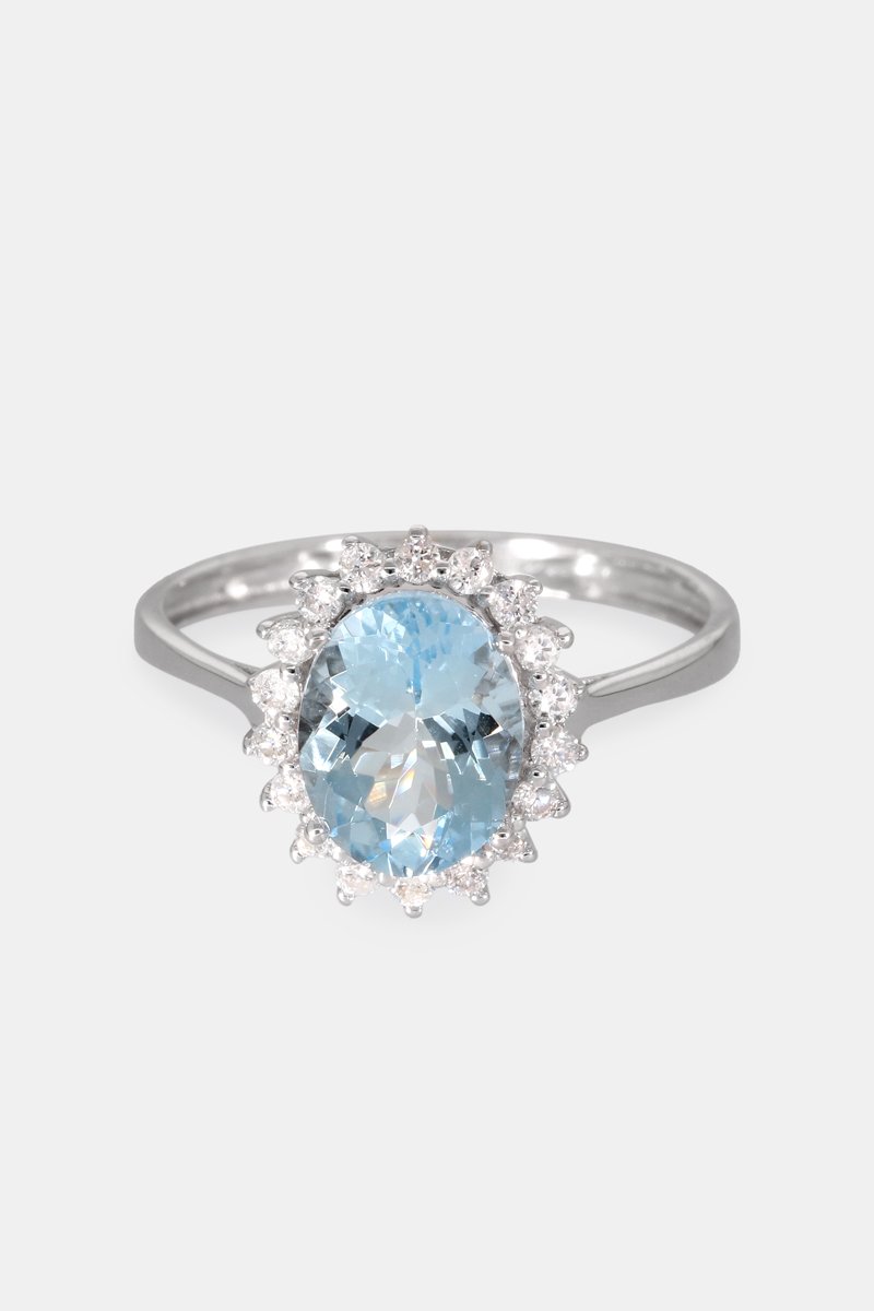 Anello in oro bianco con un’acquamarina e 18 diamanti.
