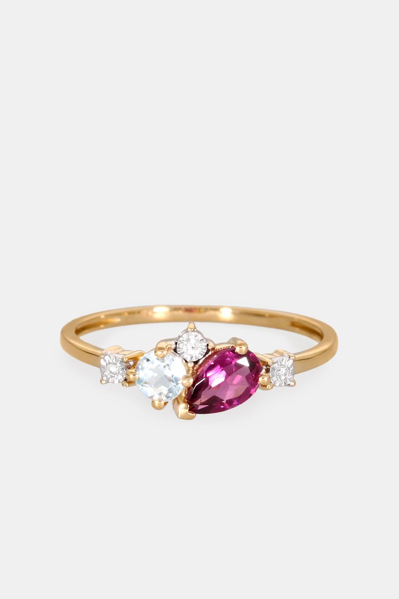 Anello - Oro giallo 18 kt, diamanti, topazio e rodolite