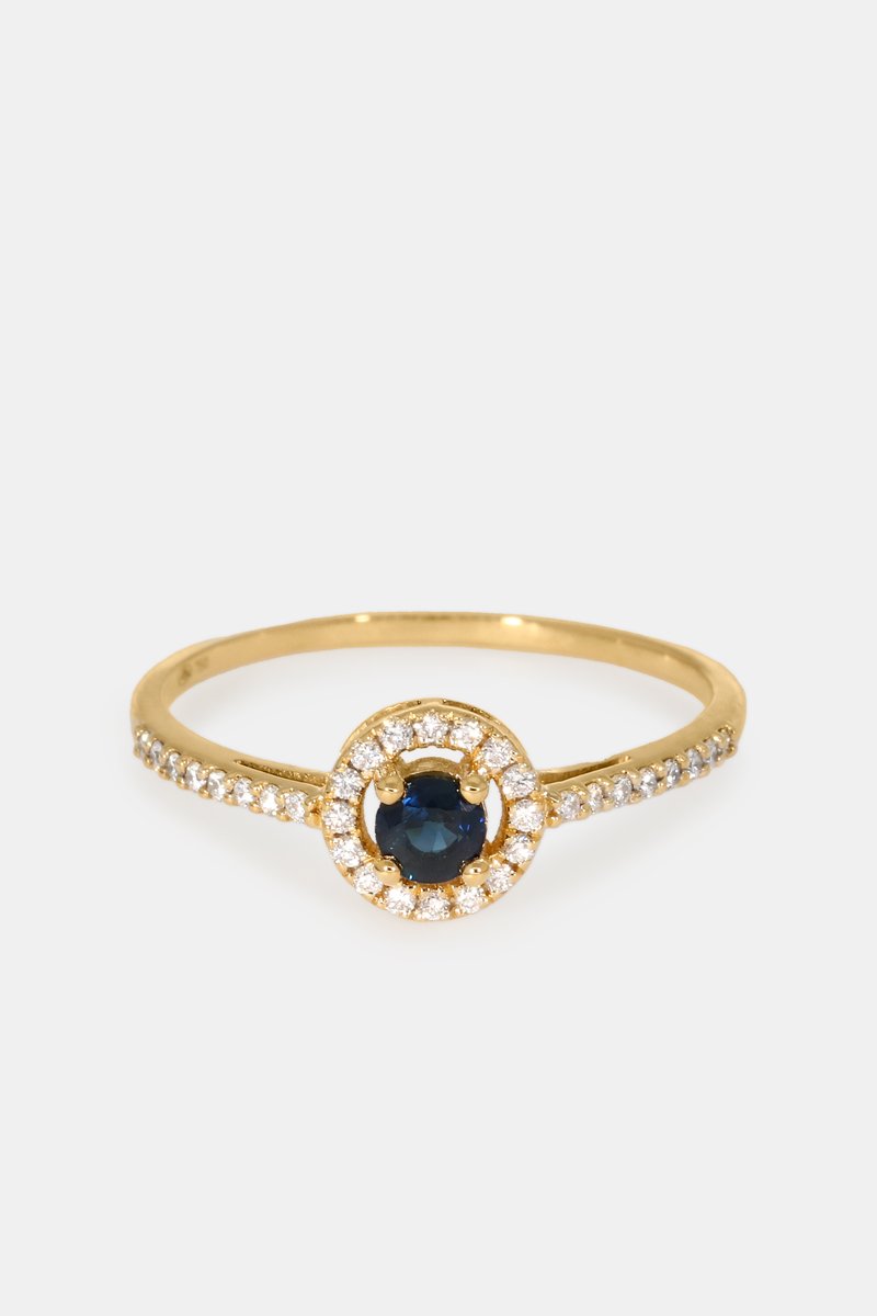Anello in oro giallo con uno zaffiro e 32 diamanti.