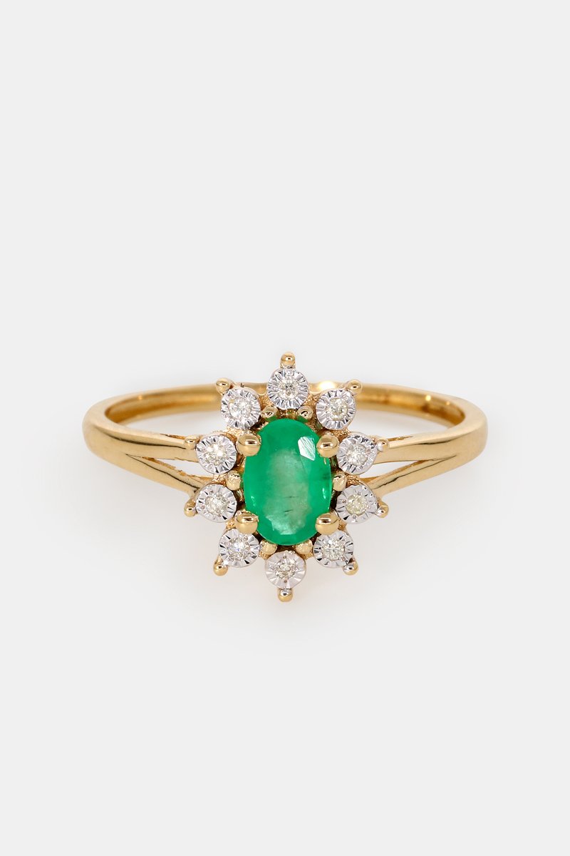 Anello in oro giallo con uno smeraldo e 10 diamanti.