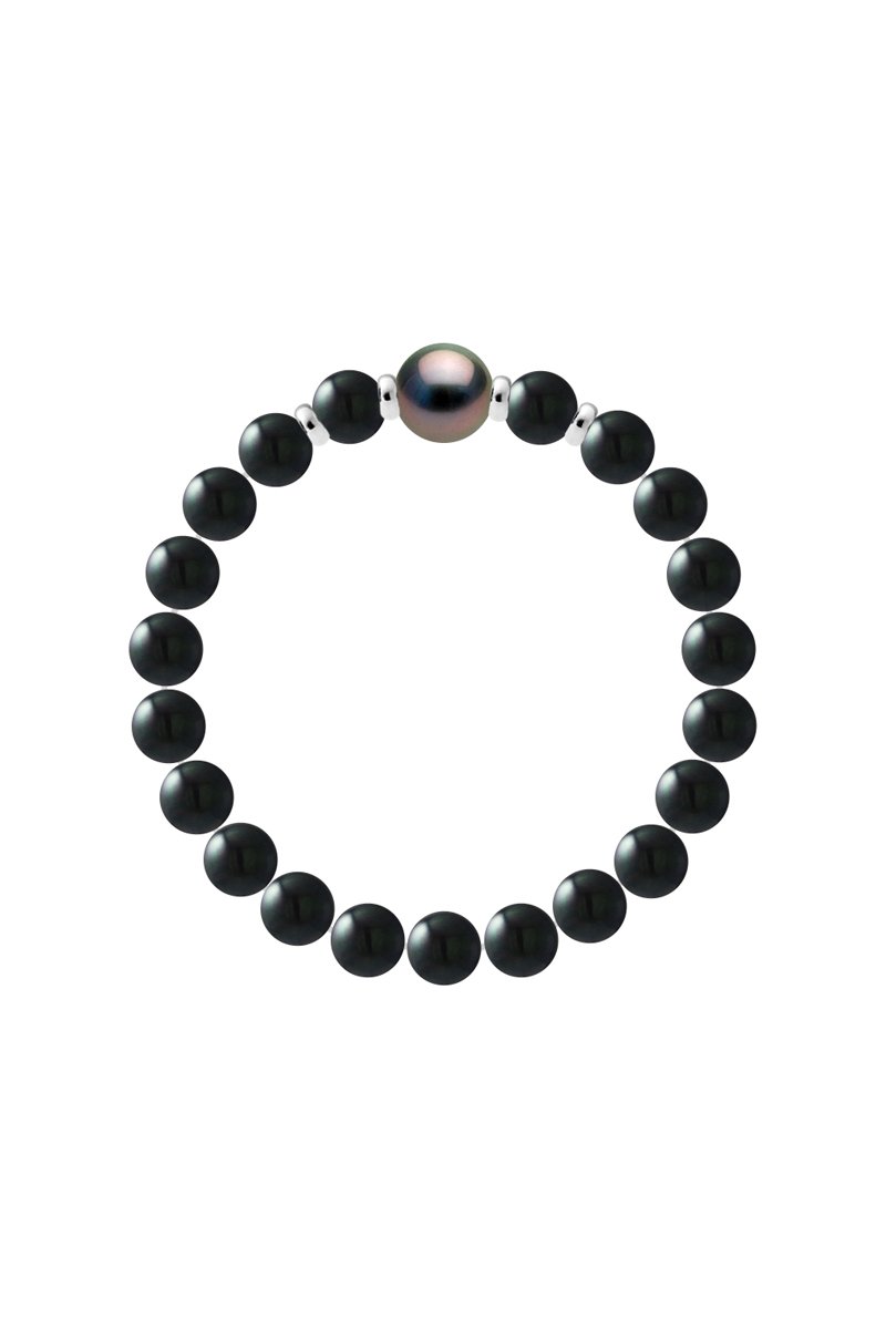 Bracciale elastico in onice e argento con una perla coltivata di Tahiti.