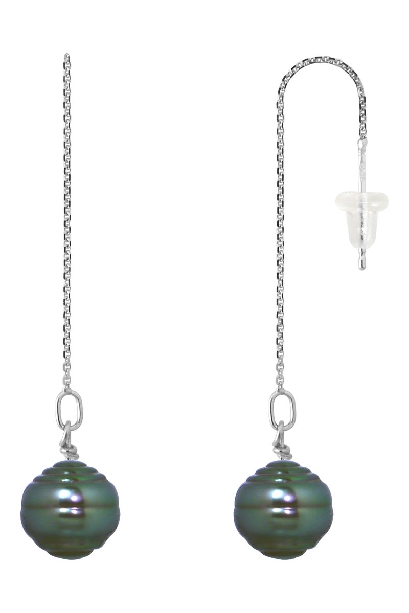 Orecchini pendenti in oro bianco con perla coltivata di Tahiti.