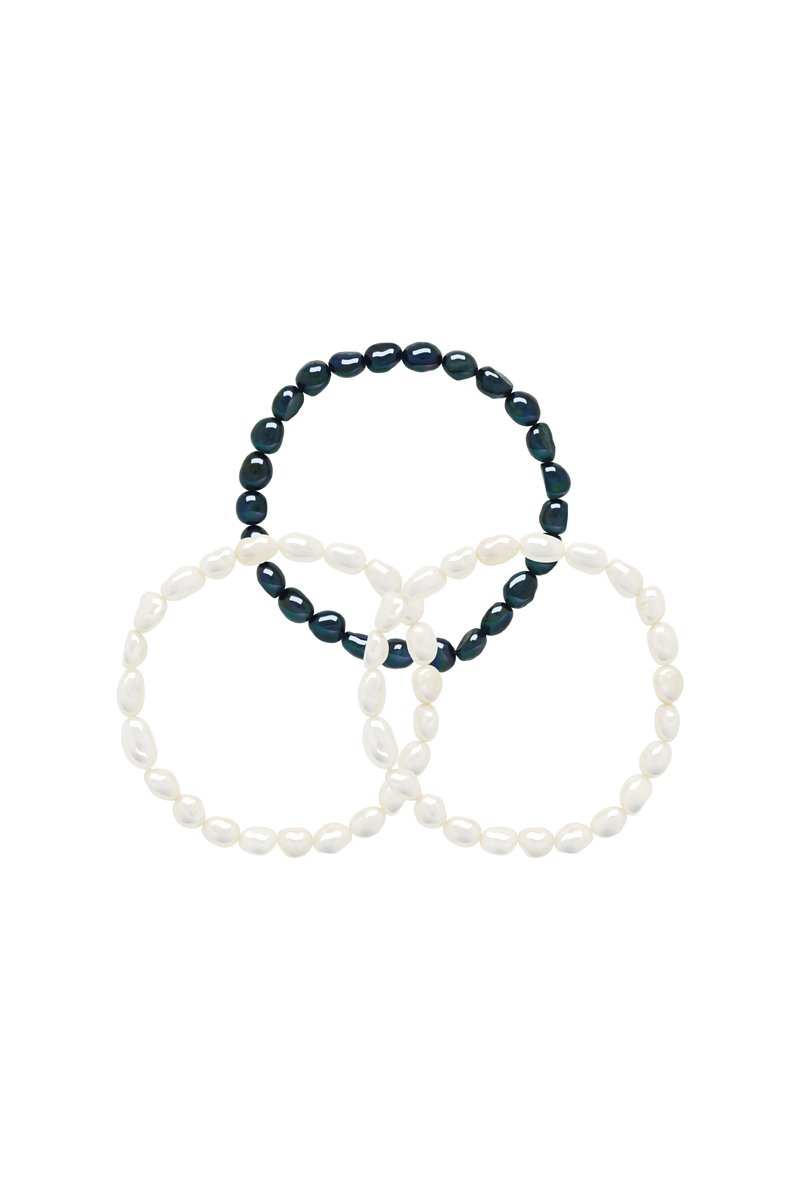 3 bracciali elastici in perle coltivate d’acqua dolce.