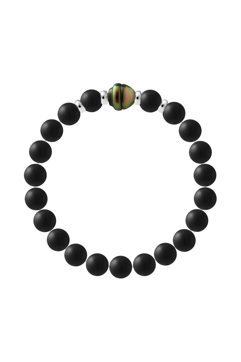 Bracciale elastico in agate e argento con una perla coltivata di Tahiti.