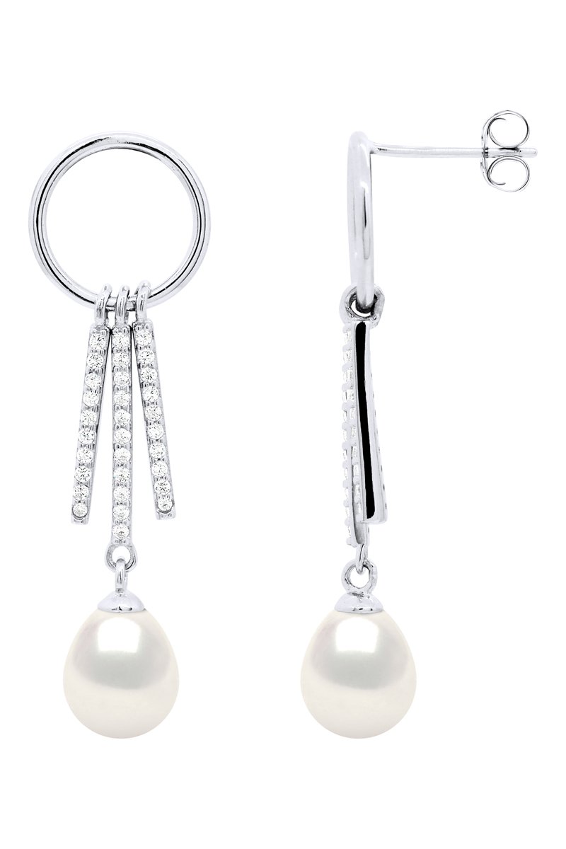 Orecchini pendenti in argento con una perla coltivata d’acqua dolce e zirconi.