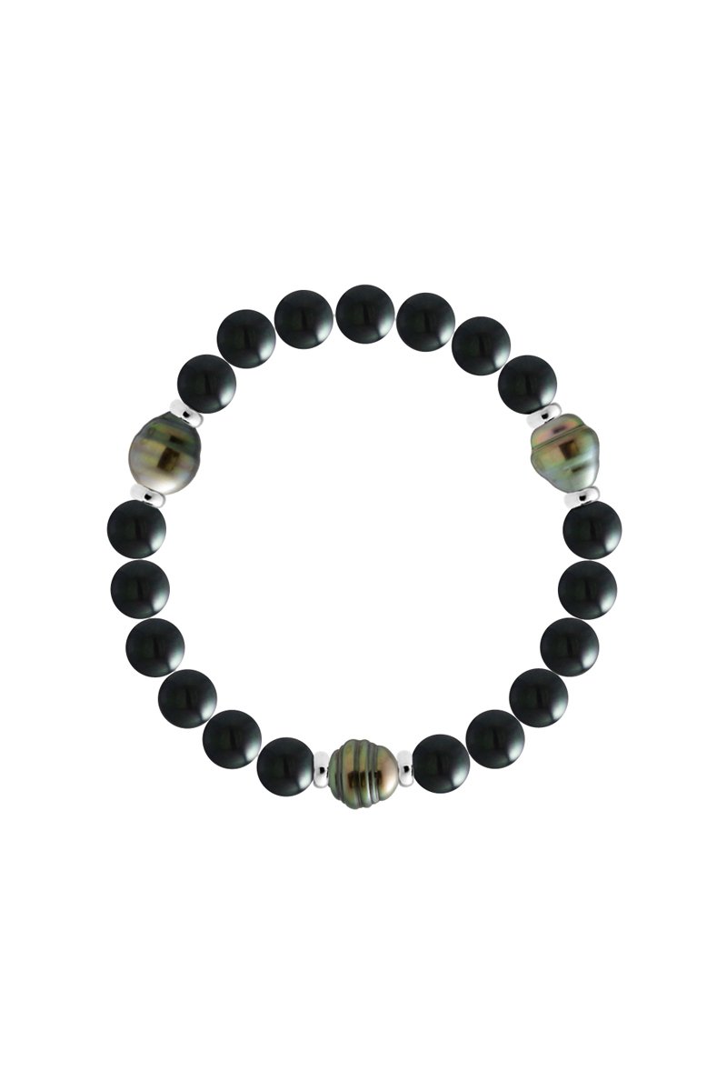 Bracciale elastico in onice e argento con 3 perle coltivate di Tahiti.