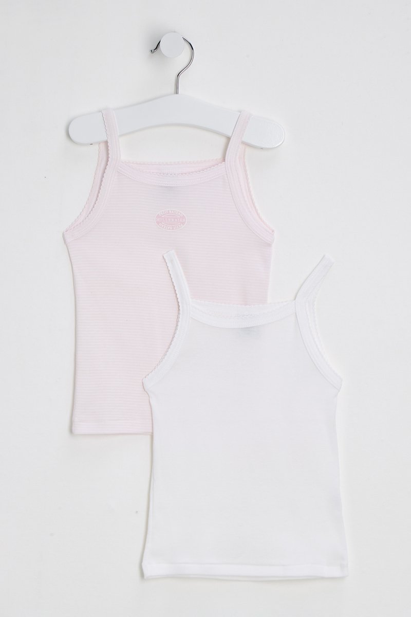 2 canotte di cui 1 con motivi a righe, scritta e logo sul davanti.