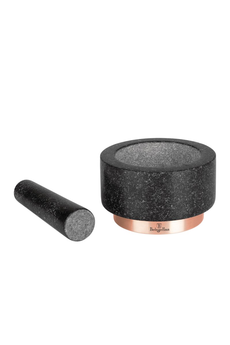 Mortaio e pestello in granit e ferro galvanizzato.