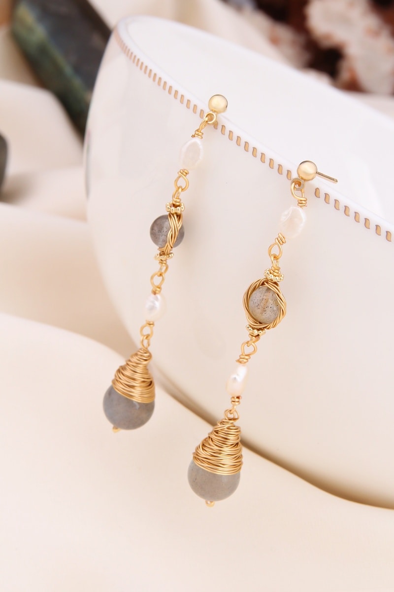 Orecchini pendenti con 2 labradoriti e perle di imitazione.