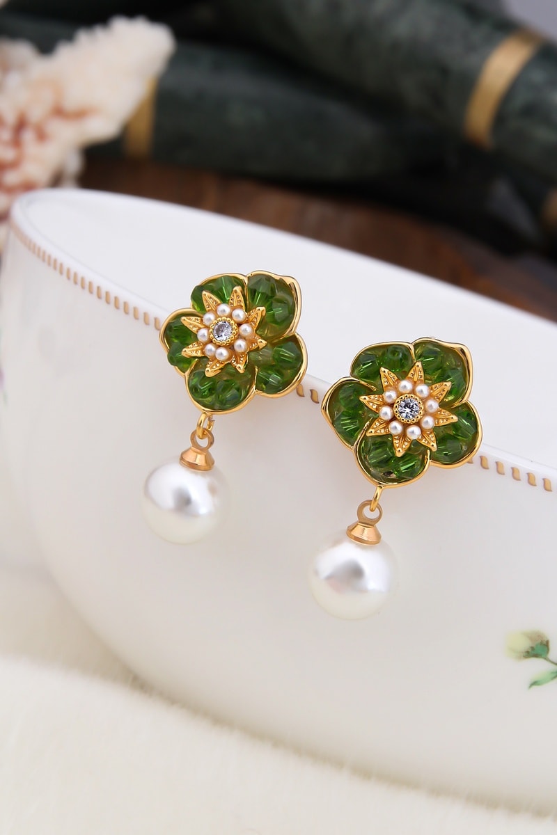Orecchini pendenti con 9 perle di imitazione e cristalli.